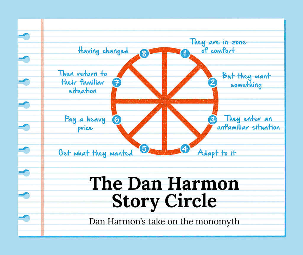In my research to overcome this, I discovered a new-to-me story framework called The Story Circle. Created by Dan Harmon (Rick and Morty, Community), The Story Circle is a simpler take on The Heroâs Journey and differs slightly from other story structures like Save the Cat and the Three Act. Iâve been reflecting on this framework and how it can help whatâs going on with me find its way into my piece.