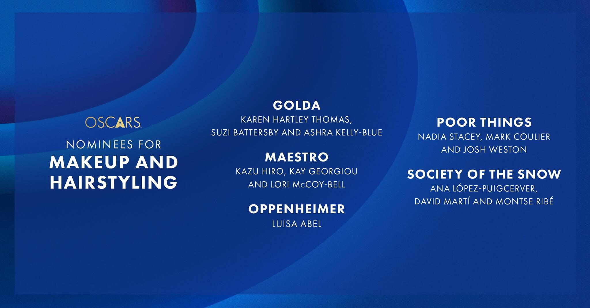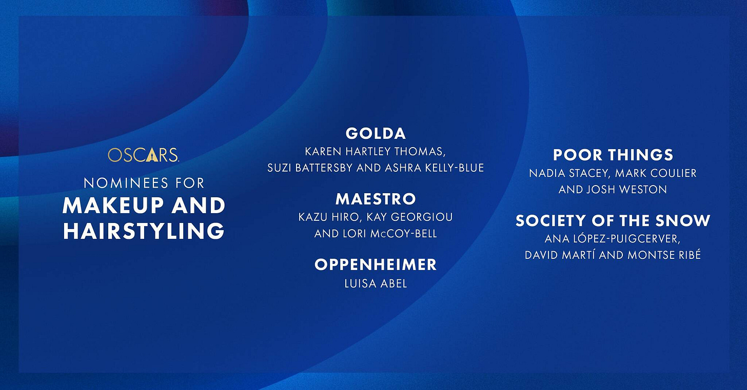 Why: While the Academy tends to select the winner based on the most obvious makeup, I do think ‘Maestro’ deserves this one. Bradley Cooper plays Leonard Bernstein from ages 25 through 70 and is fully believable at each stage due to the stunning work by Kazu Kiro. But, I would love it if ‘Society of the Snow’ took this one to encourage more people to see that film.