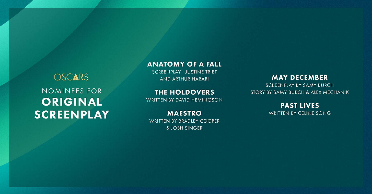 Why: I think many Academy members are upset that ‘Anatomy of a Fall’ wasn’t France’s submission for Best International Feature so they’re going to want to award it here. Plus, this film is basically a courtroom drama that’s 90% dialogue so a writing nod makes a lot of sense here.