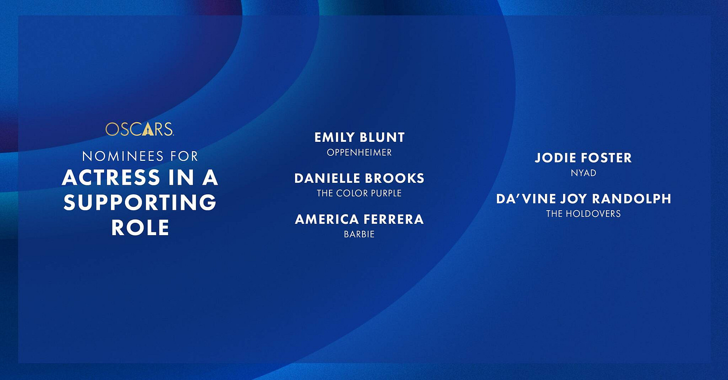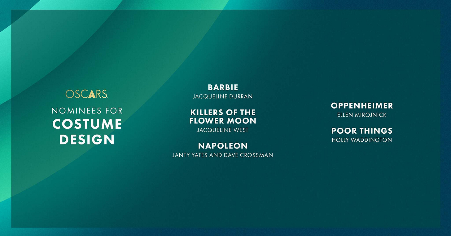Why: I think 'Barbie' and 'Poor Things' will split Costume Design and Production Design, so I’m leaning toward 'Barbie' for this one just because the costumes are nostalgic, iconic, and memorable.
