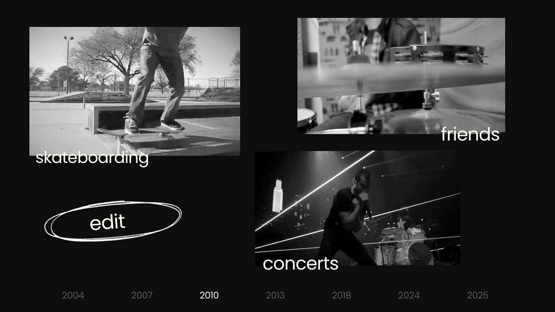 By 2010, I had a camcorder and began documenting life around me. Concerts, friends, skateboarding—capturing moments and piecing them together. That’s when I learned to edit.