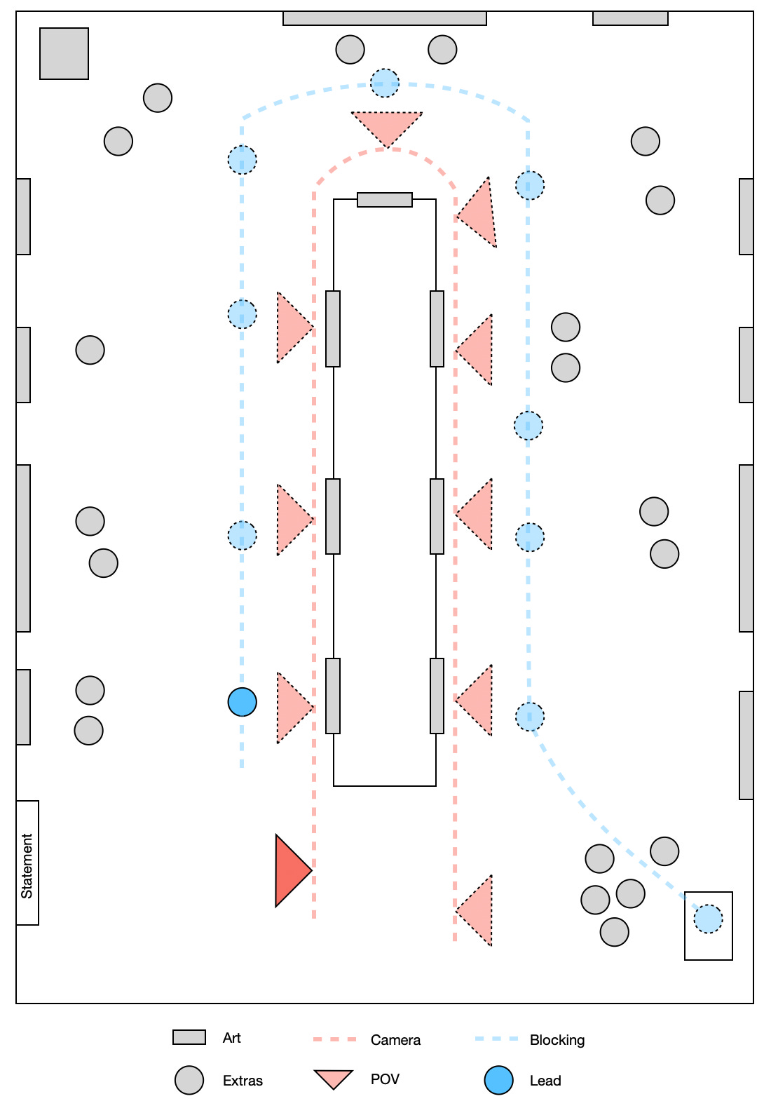 As I thought about filming and editing, I simplified the style to be shot in one take. I want the film to feel immersive, from the perspective of the artwork. This idea came from my love of eavesdropping in art galleries—listening to strangers critique the pieces on the walls—and from films like Before Sunrise and Frances Ha, where movement and dialogue guide you through an emotional journey.